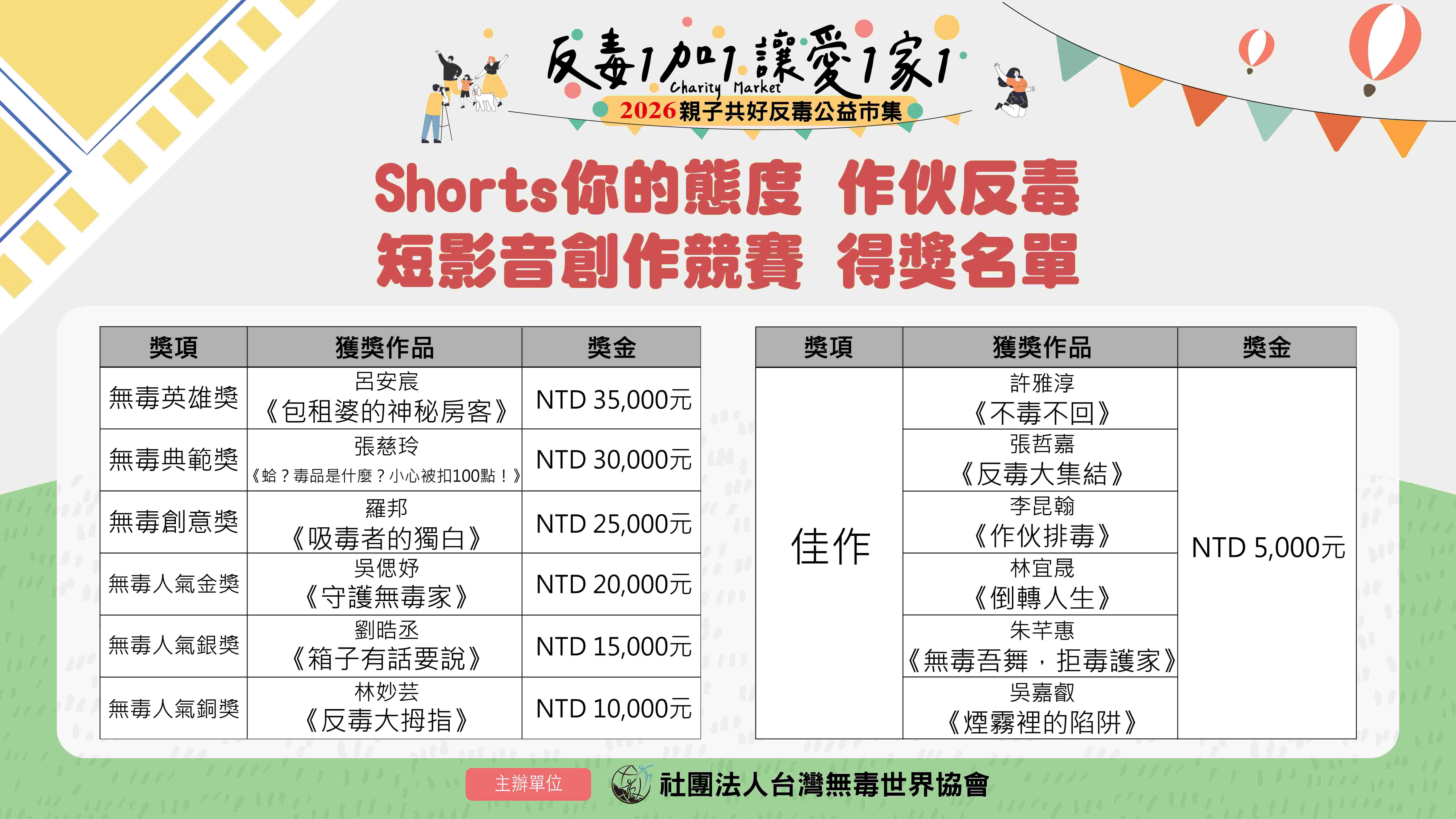 再次感謝每一位參賽者的熱情參與,讓我們持續用創意與行動,一起為 無毒的未來 努力前進